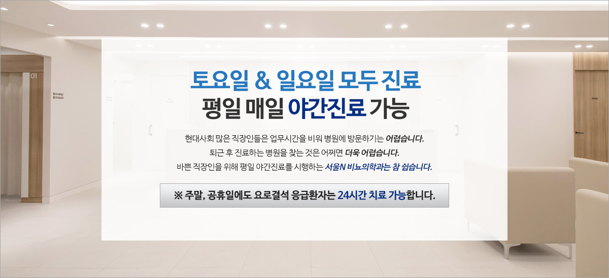 전립선염은 주로 사무직 직장인에게 많이 발병됩니다. 본원은 피로회복을 위한 마사지와 수액클리닉을 구비하고 야간진료를 시행하며 직장인분들께 도움이 되고자 합니다.